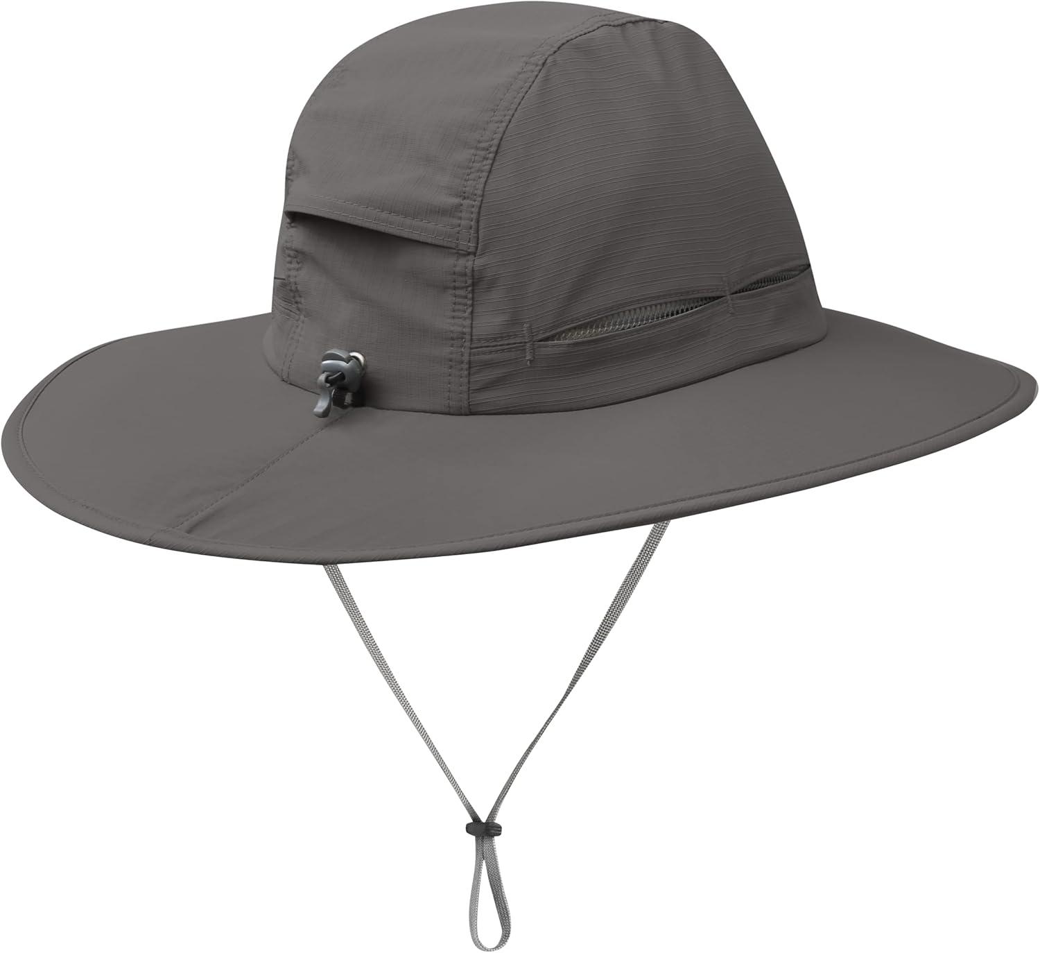 Whether you're logging hours on the trail, down the river, or in the garden–the Sombriolet hat from Outdoor Research will keep your head and face protected from the sun and heat. The lightweight hat utilizes SolarShield construction with nylon/polyester blended fabric to provide UPF 50+ sun protection. Meanwhile, strategically placed vents in the crown, and moisture wicking mesh lining keep you cool and dry. Ready for any adventure, the hat is equipped with piping along the brim edge for wind resistance on land or sea, as well as a foam-stiffened brim, so that the hat won't disappear if you drop it in the water. A TransAction headband maintains a secure fit while also wicking away moisture, and external drawcord adjustment and a removable chin cord with cordlock ensure that the hat stays in place.